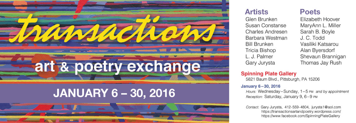MVA artists Gary Jurysta and Glen Brunken, along with artists Susan Constanse, Charles Andresen, Barbara Westman, Bill Brunken, Tricia Bishop, L.J. Palmer, and poets Elizabeth Hoover, MaryAnn L. Miller, Sarah B. Boyle, J.C. Todd, Vasiliki Katsarou, Alan Byersdorf, Shevaun Brannigan, and Thomas Jay Rush.