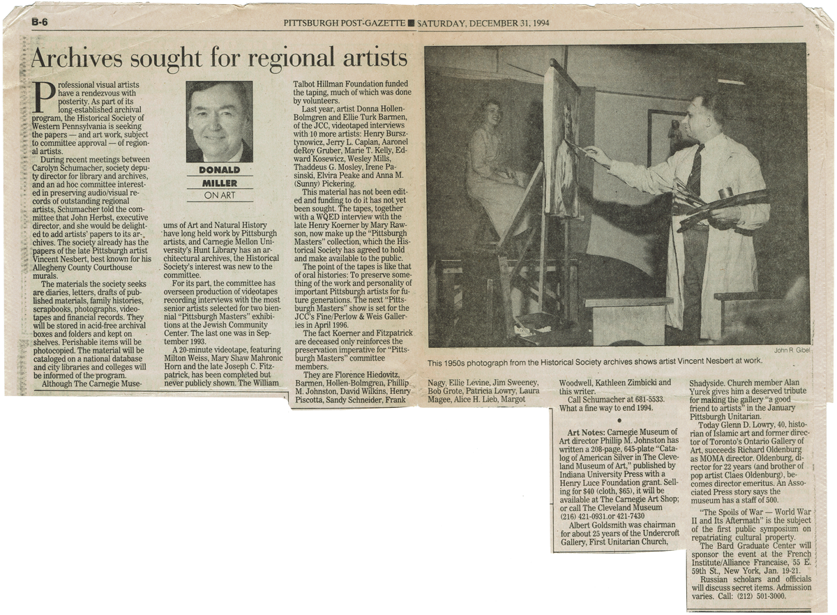 In 1993, Donna Hollen Bolmgren and Ellie Turk Barmen began interviewing and video recording each of the artists working in their studios. In subsequent years, Jerry Caplan joined Donna in the video documentation process. Several of the artists were interviewed and recorded by crews from WQED who generously volunteered their time and talents. In 2013, the staff of Pittsburgh Filmmakers produced ten artist videos. The entire collection of featured artists’ stories and videos are documented and preserved for future generations in the History Center’s Detre Library & Archives.