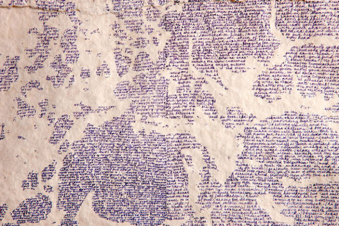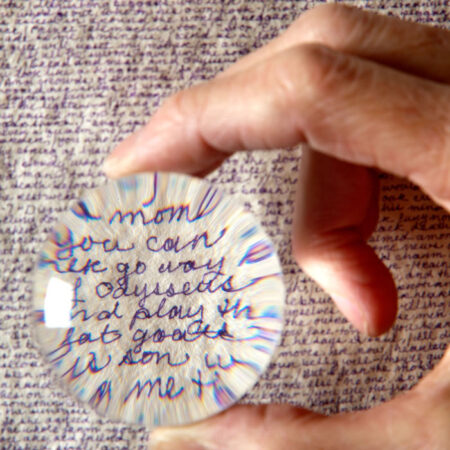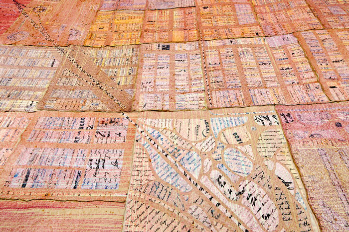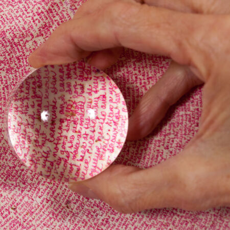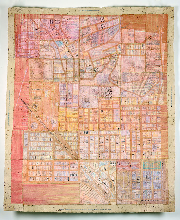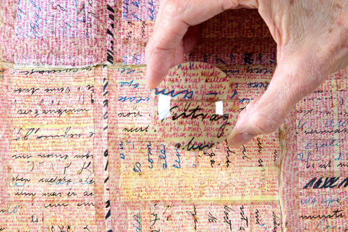 “Diane Samuels is a visual artist, with studio and public art practices. In both she uses other peoples’ words and handwriting as her literal and figurative raw material. She builds works that accrete from community engagements, layer by layer: layers made of words from interviews and informal conversations with people on the street, in cafes, in their homes; layers made of places from castings, drawings, photographs, audio, maps; and layers made from archival documents, narratives of events, histories, memoirs, folk tales, and literature. She has made drawings by writing out the texts of entire novels in micro-handwriting, converted a two-story glass pedestrian bridge into an anthology of phrases about looking at the world closely, and created artist’s books from sessions transcribing storytellers. She is also co-founder of City of Asylum Pittsburgh, which provides sanctuary to writers in exile.”