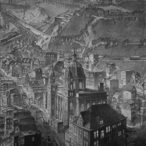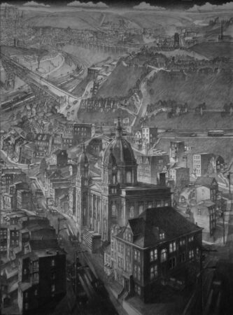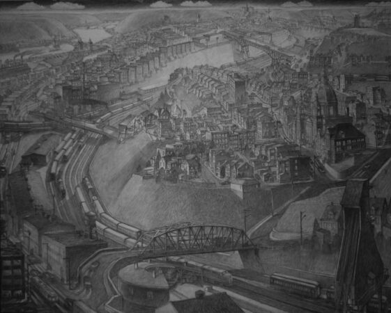 Doug Cooper, professor, Carnegie Mellon University School of Architecture. “Combining story, history and memory into panoramic murals has become the theme of Doug Cooper’s work. He typically works with local residents and incorporates their lives into the works. He developed his first mural, now at Pittsburgh’s Heinz History Center, with a Pittsburgh senior center (1992). In 1994 he completed another with elderly for the Philadelphia Courthouse. The 200 ft-long mural for Carnegie Mellon Center (1996) shows the campus and Pittsburgh in three time periods. The mural series for Seattle’s King County Courthouse (2005) depicts the geography, history and land-use patterns of that region. On two occasions, Cooper has used mural projects as vehicles for foreign language instruction. In 1996, assisted by CMU students, a German professor and Frankfurt elderly, he created a 9m x 6m mural for Frankfurt’s central market. A similar process was used for the University of Rome mural (2005). ”