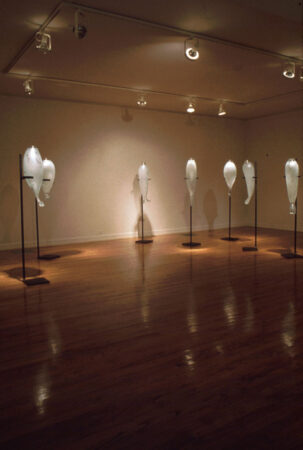 “Since 1969, Kathleen Mulcahy has been creating works of art from glass and mixed media. With a Masters of Fine Arts in glass sculpture and three-dimensional design from Alfred University, she directed glass studio programs at Bowling Green State University in Ohio and Carnegie Mellon University in Pittsburgh then went on to develop the Pittsburgh Glass Center, one of the top public access glass studios in the nation. During this time, her own work — installation pieces, cast glass, blown glass objects — evolved into unique and poignant statements. Kathleen received Fellowship Awards from the Pittsburgh Cultural Trust, The Pennsylvania Council on the Arts, The Creative Glass Center of America, The Lusk Memorial Award through the Fulbright Foundation, The Mid Atlantic Arts Foundation and the National Endowment for the Arts. In 1992, she was selected as Artist of the Year by the Pittsburgh Center for the Arts. Her works are in many public and private collections including the American Craft Museum, The Corning Museum of Glass, The Carnegie Museum of Art, The Renwick Galleries of the Smithsonian Institution and The Westmoreland Museum of Art. In 1997, she was selected as Fellow of and Artist in Residence at the Cité Internationale des Arts in Paris, France. She lives and works in Oakdale, Pennsylvania with her husband and partner Ron Desmett.”