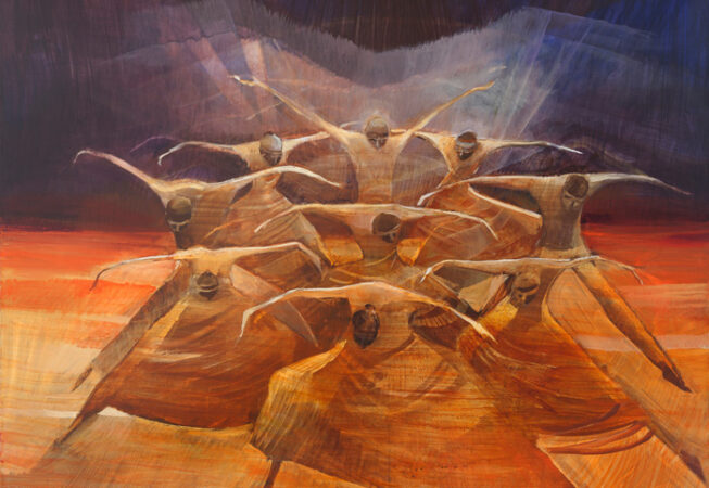 “I use a strong diagonal thrust to add power to the motion. I work by applying many layers of paint to the canvas, building a complex surface of planes and color. Visually, I like the sense of depth that I can get from this technique, and thematically it reflects the way I see the world. My inspiration often comes from dance, music, and events happening around us.”